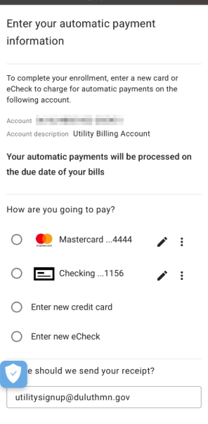 Back in the Utility Access Portal (this remains open in another tab), begin enrolling in autopay. For each account you will be able to select the appropriate saved method.