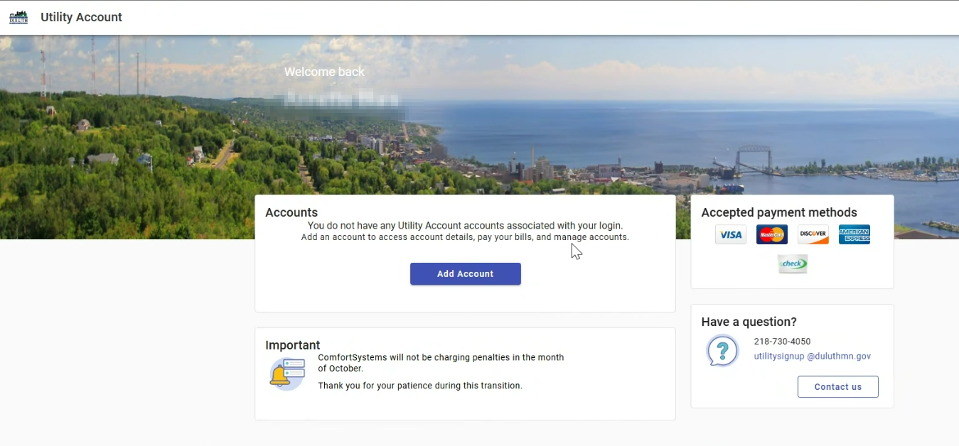 Enter the account Credentials. ComfortSystems account numbers are formatted 12345679-001 or 123456789S-001. Enter the name exactly as it appears on the bill. Click Add Account